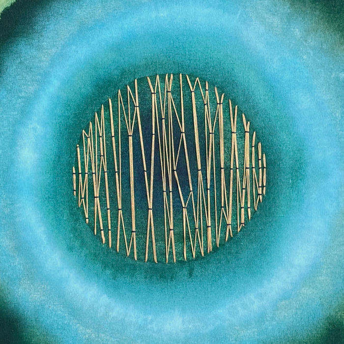 Acrylic ink and gold thread on raw canvas, 2023