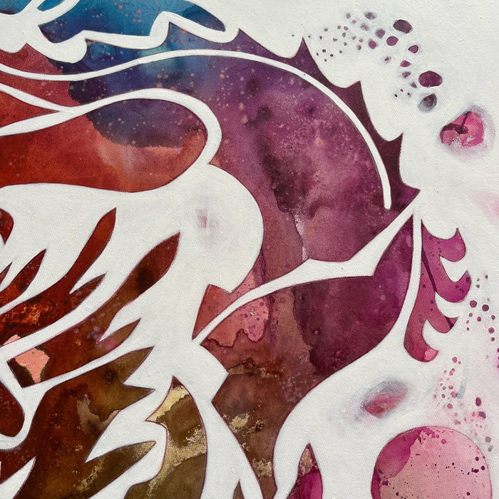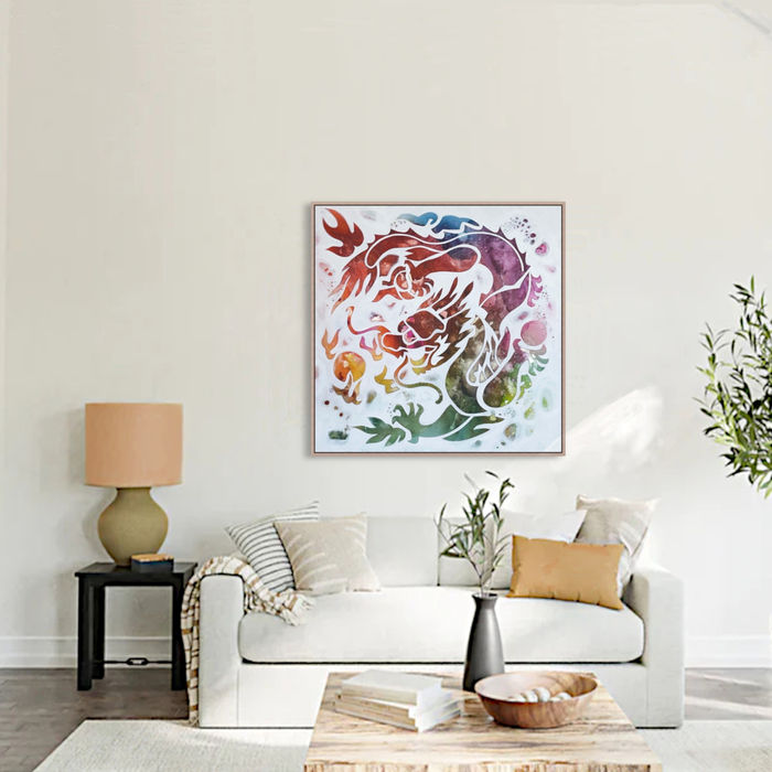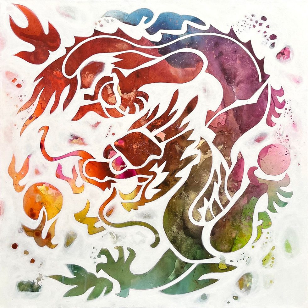 The painting showcases a Chinese dragon in a stylized and abstract form, representing the mythical creature with a modern twist. The dragon's sinuous body is depicted with bold, flowing lines, giving it a dynamic and energetic presence. I have deliberately forsaken intricate details in favour of a simplified, cut-out design approach, which adds to the artwork's contemporary and eye-catching appeal, in it's burst of colours and hints of gold.
