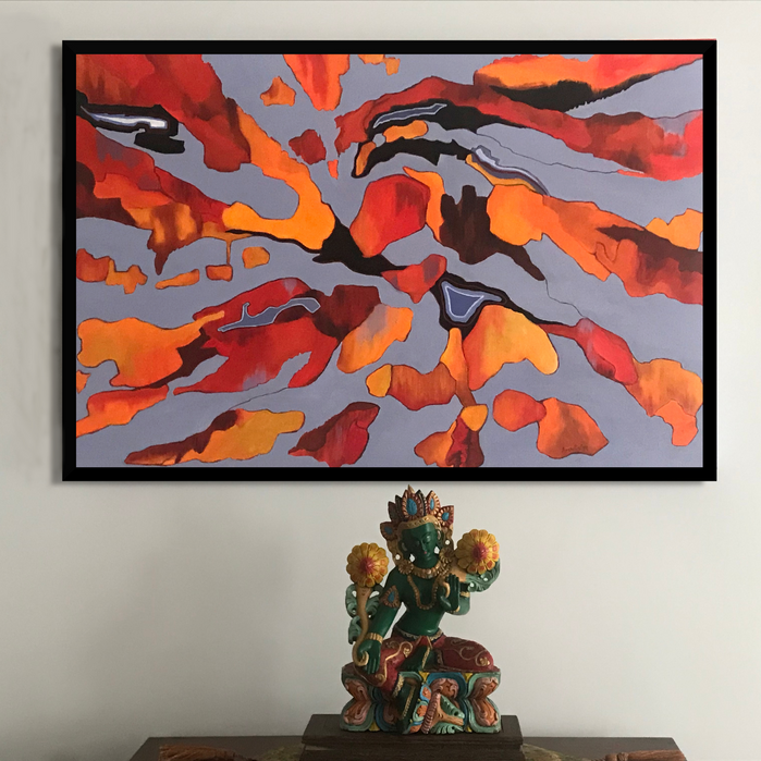 This painting was created from remembrances of childhood, walking the little lanes of the languid neighbourhood of Mumbai where I grew up. The dazzling colours of gulmohars, yellow copper pots, Flame of the forest and coral trees against a backdrop of gathering storm clouds. The torpor of the last days of May, before the stillness was shattered by the tumult of the monsoon.